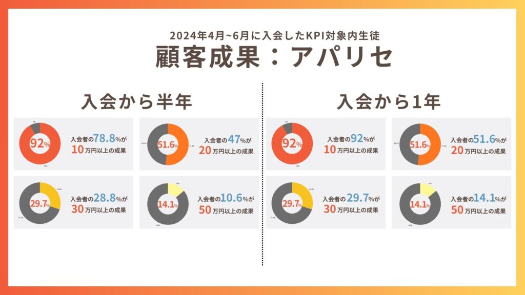 アパリセは受講生2,700名超え(2025年7月時点)、1年後92%が月利10万円以上、51.6%が月利20万円以上を達成しています。(2024年4月~6月入会者のデータ)