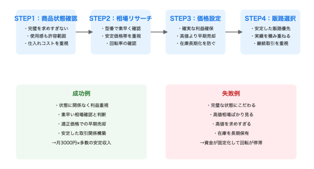 古物市場や業者オークションでの適切な状態判断を行い、安定した利益を狙っていきましょう。